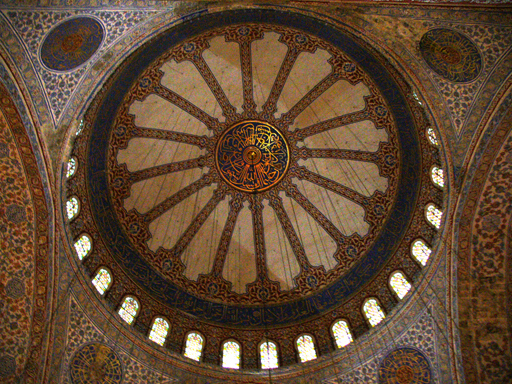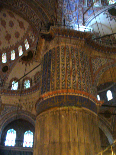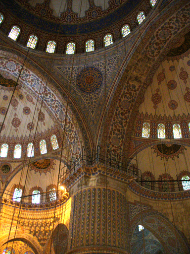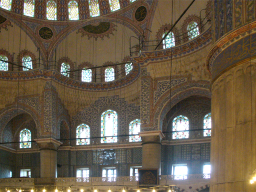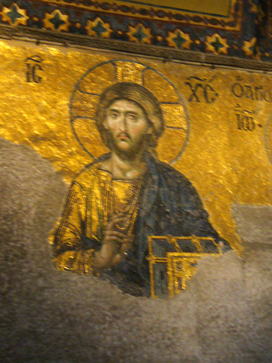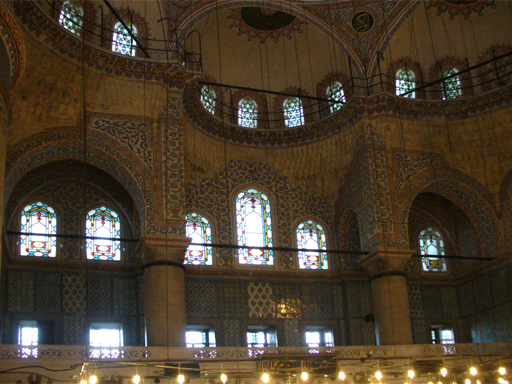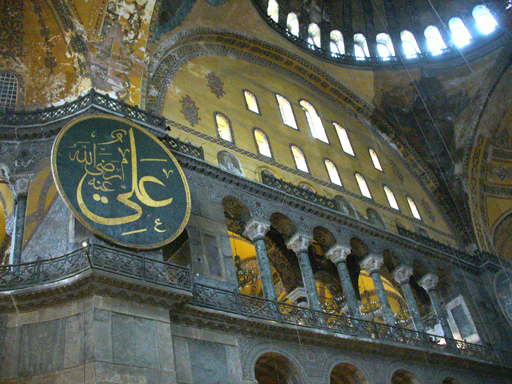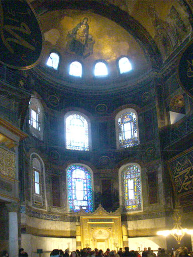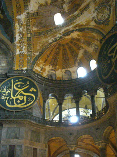 An interior shot, showing some of its former beauty. After the Ottoman conquest of 1453, it was turned into a mosque, the the mosaics were plastered over and the large medallions with the names of Allah and Mohammed were placed there.