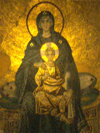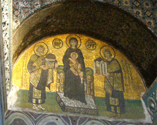 Over the entrance was a mosaic showing the Virgin and Christ between Constantine and Justinian. To the right Justinian is offering to Mary a model of the new city of Constantinople. To the left Justinian is offering a model of the new church.