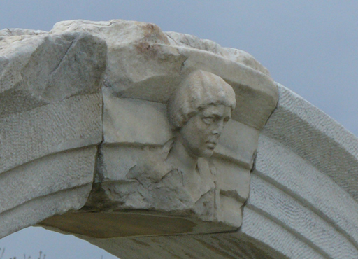 An arch in the in the west portico with a portrait carving of Faustina II, the wife of Marcus Aurelius, who rebuilt the agora after the earthquake of 178 AD.