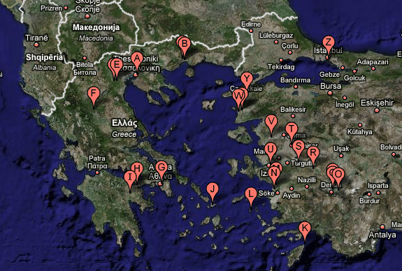 From March 9 through March 12, 2008 a group of 17 people traveled on a tour of Greece from Thessalonica (A below) to Athens(G), offered by Pilgrim Tours. In Athens another group of 18 joined us for a day in Corinth(H) and Mycenae(I) before we all boarded a ship for a cruise to three of the Greek islands: Mykonos(J), Rhodes(K) and Patmos(L). We docked in Kusadasi(N) in Turkey where 9 from the original group spent the afternoon in Ephesus(M) and then returned to Athens. The remaining 27 of us also spent the afternoon in Ephesus and then went on to see the sites of the seven churches John mentioned in the Book of Revelation. The tour for us ended in Istanbul(Z).