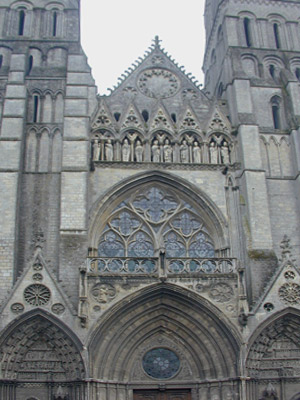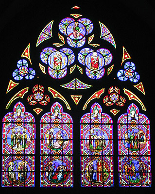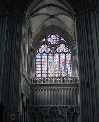 After we saw the tapestry, we had about half an hour to see the large cathedral at Bayeaux. Following are views of the front and back as well as two shots of the stained glass.