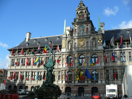 The city hall or rathaus. The Stadhuis (City Hall) dominates the Grote Markt of Antwerp. It was completed in 1565. The baroque fountain in front is the Brabo Fountain, which depicts the legend of how Antwerpen got its name. The legend is that a giant, Druon Antigoon, lived near a narrow bend in the Scheldt River and collected a toll from anyone navigating the river. Druon chopped off the hand of anyone who refused to pay. A Roman centurion named Brabo eventually killed the giant, cut off his hand, and threw it into the river. Hand werpen (hand throwing) evolved into Antwerpen.