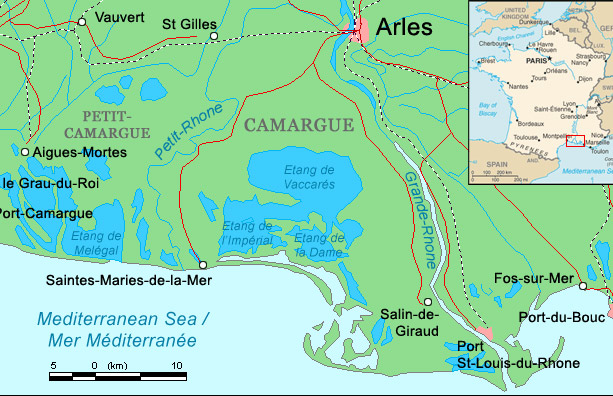 With an area of over 350 sq. miles, the Camargue is western Europe's largest river delta, bounded by the Rhone to the east, the Petit Rhone to the west and the Mediterranean Sea. It is a vast plain comprising large brine lagoons cut off from the sea by sandbars and encircled by reed-