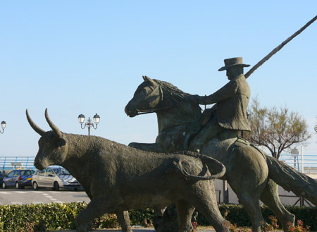 A statue in the center of town of a gardian on his horse rounding up one of the black bulls of Camargue.