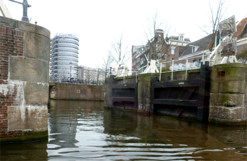 Three times a week, 14 of the 16 existing water locks around the city close up, so clean water can be pumped in from the big lake IJsselmeer. The current that creates pushes the dirty canal water out through the open locks on the other side of the city.