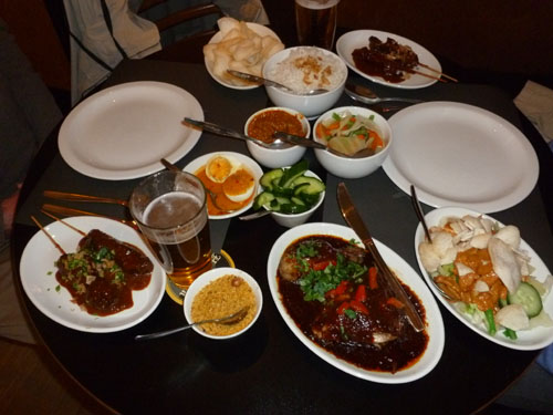 Later in the evening we went to the Kantjil & de Tijger restaurant for an Indonsian rijsttafel (rice table.) For the two of us we had 11 small dishes, including pork satay, chicken satay, baked chicken, spicy beef, veggies in peanut sauce, another veggie, cucumber, kropek (deep fried crackers), ground peanuts, boiled egg in sauce, all to be eaten with rice. Although the dishes served are Indonesian, the rijsttafel's origins were colonial. During their presence in Indonesia, the Dutch introduced the rice table not only so they could enjoy a wide array of dishes at a single setting but also to impress visitors with the exotic abundance of their colony. Tomorrow we do still more exploring in Amsterdam. |