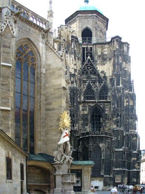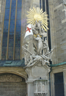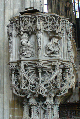 The 18th century Baroque statue shows St. Francis under an extravagant sunburst, trampling on a beaten Turk. This was the original cathedral's main pulpit inside until it was replaced by Pilgram's pulpit in 1515.