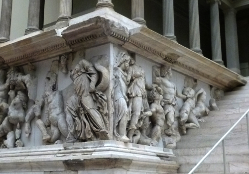 The frieze took over 20 years to reassemble from thousands of fragments uncovered in modern-day Bergama, Turkey. Most fascinating is the frieze around the base, which depicts the struggle of the Olympian gods against the Titans. It is strikingly life-like, with figures that project as much as a foot from the background..
