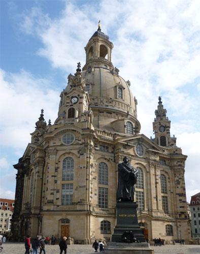 A view of the Frauenkirche from the other side with the statue of Martin Luther in the foreground.