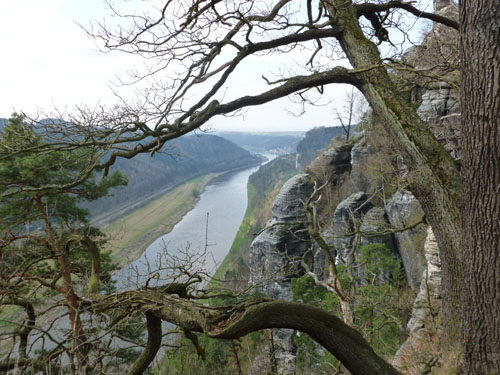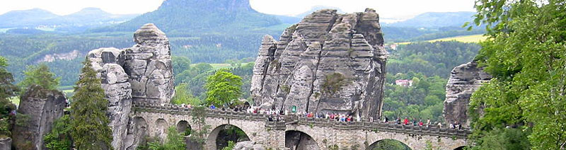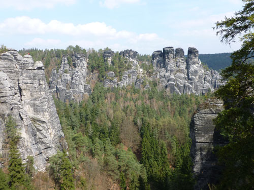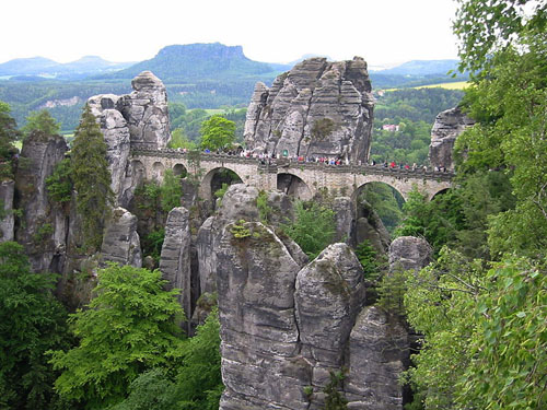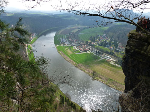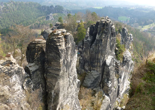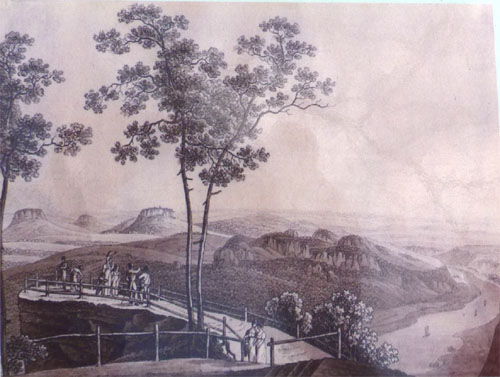 We were taken by bus to the Bastei, a spectacular rock formation towering 194 metres (636 feet) above the Elbe River in the Elbe Sandstone Mountains of Germany. This was our first view as we walked from the bus. ![]() A view as we got closer to the viewpoint. ![]() Here we see the viewpoint on the right and the Elbe below. ![]() A view of the Elbe from the viewpoint. ![]() The Elbe in the other direction. ![]() A Wikipedia photo of the famous Bastei bridge, made of sandstone in 1851. ![]() We would soon be walking on this bridge. ![]() Two more views of the bridge. ![]() ![]() A view from the bridge. In the upper left you can barely see the red figure of a climber. ![]() A telephoto shot of two climbers. There are some 14,000 climbing routes on over 1,100 rock pinnacles. At the beginning of the 20th century, the Saxon Rules for rock climbing were established. They are considered to be one of the origins of free climbing. Ropes and bolts may only be used for safety but never as a means of climbing. The use of chalk and common means of protection such as nuts and friends is also not permitted; instead knotted nylon slings are used. With a few exceptions, climbing is only practiced and permitted at freestanding rock towers. ![]() Near the overlook was a sign with a photo of Adrian Zingg's drawing of the overlook. ![]() One more look at this spectacular view. Next we ride a bus to Prague. |