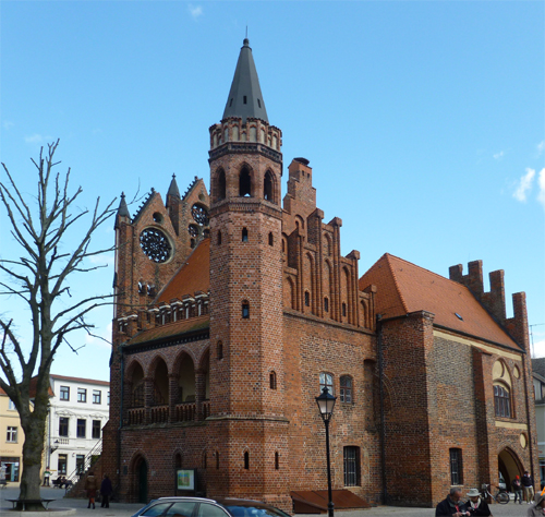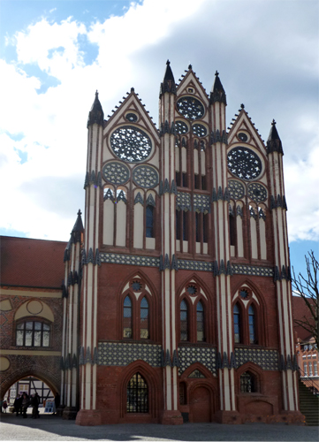 The Tangermünde Town Hall is a late medieval building constructed in the 1430s. This building contains gothic and Romanesque structural elements that appear on the exterior of the building. Some of the more prominent features of the town hall are its high gables. On the façade are three staggered gables, with one central gable extending above the peak height of the roofline. These gables are a feature of brick architecture during this period. Adorning each gable are miniature spires, evocative of high gothic architecture popularized on cathedral exteriors. Each gable contains one large central circular window with two smaller ones below it, all with highly decorative tracery. These central circular windows are reminiscent of the grandiose rose windows that appear on the west façade of many gothic cathedrals.