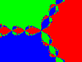 x basin _____________________ -0.78240 green -0.78242 red -0.78244 blue -0.78245 green -0.78246 blue -0.78248 red -0.78250 blueIt is even more interesting to note that between the first two points above is the point x = -0.782413 which lies in the blue basin, between the second and the third points is x = -0.7824333 which lies in the green basin, and between the third and the fourth points we find -0.7824495 which lies in the red basin! Certainly this is a very sensitive area of the graph.